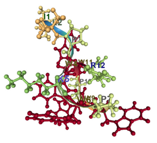 Indolicidin is a well-studied, short, 13 amino acid Trp-rich antimicrobial peptide. It belongs to the cathelicidin family of peptides. The proportion of Trp residues in indolicidin is the highest (about 40%). The peptide is unordered in water and adopts a wedge-type shape in the micelles [89]. Trp residues are segregated from positively charged ones and situated in a trough between positively charged regions (Figure 7). It has been shown that indolicidin can cross the membranes at concentrations above the MIC but below the minimal lytic concentration [90].