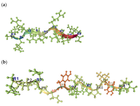 Representative structures constructed on the basis of MD trajectories simulated for the AMPs: (a) R9 (DBAASP [17] ID = 9015), and (b) Astacidin (DBAASP [17] ID = 2145). Side chain heavy atoms are represented in ball-and-stick, and the backbone is represented in cartoon color-coded by residue index.