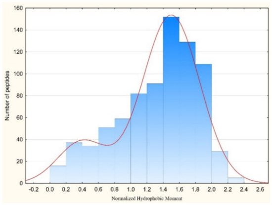At the same time, the distribution of pairs of Gly in the set of ribosomal peptides allows us to suppose that Gly’s function is to support the aggregates of AMPs. It is known that GxxxG motives in the alpha-helical fragments of the transmembrane proteins are responsible for the formation of alpha-helical associations in the membrane environment [20]. The results that indicate that the abundance of pairs of Gly with the distances of 3, 4, 5, and 6 residues along the chain are not random (Figure 4c) can be explained by demanding that the motives aggregate. However, the kinks can also be considered as supporting interactions between helices (resulting in the formation of helical aggregates).