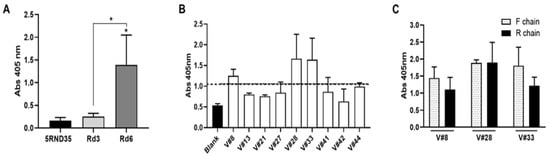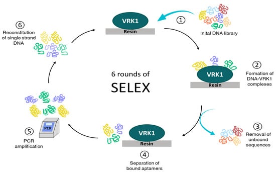 Iterative rounds of selection and amplification of ssDNA aptamers were performed in order to obtain aptamers for recombinant VRK1 (Figure 6). In brief, synthetic random library of ssDNA that contains a central randomized region of 35 nucleotides flanked by two conserved 19- and 20-nucleotide regions in each end (5RND35, 5′-ACGCTCGGATGCCACTACAG-35N-CTCATGGACGTGCTGGTGA-3′) was denatured at 95 °C for 10 min and then cooled on ice for 10 min. For the first SELEX round, 25 µg (1 nmol) of RND35 were mixed with 4.7 µg (100 pmol) of VRK1 in 200 µL of selection buffer (10 mM sodium phosphate, 0.15 M NaCl, pH7.5 (PBS), MgCl2 1 mM, BSA 0.2%) and incubated at 37 °C for 1 h. The bound aptamer–VRK1 complexes were purified using Ni-NTA superflow (Qiagen, Hilden, Germany) and the ssDNA bound to the protein were amplified by PCR using the primers named F5 (5′ ACGCTCGGATGCCACTACAG 3′) and R5 (5′ TCACCAGCACGTCCATGAG 3′) under the following conditions: 0.4 µM each primer, 200 µM dNTPs, 2 mM MgCl2, and 1 U Taq DNA polymerase (Biotools, Madrid, Spain) in a final volume of 100 µL. The mixture was thermally cycled 20 times through 95 °C for 20 s, 66 °C for 15 s and 72 °C for 30 s. Double-strand PCR product was ethanol-precipitated, and the new ssDNA population was then obtained and structured by heating the dsDNA at 95 °C for 10 min and cooling on ice for 10 min. After rounds 3 and 6, the pool was amplified and labeled using digoxigenin-labeled primers F5 and R5.