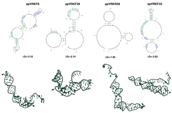 Secondary structure prediction was performed on aptamers apVRKF8, apVRKF28, apVRKR28 and apVRKF33 using the mFold software and the QGRS Mapper program to predict G-quadruplexes in nucleotide sequences which strongly stabilizes tertiary structures. Figure 2 shows the most probable secondary structure of these aptamers according to its lower free energy (ΔG). Furthermore, analysis showed that apVRKF8 and apVRKF33 could form two G-quadruplexes structures, while apVRKF28 could form only one. According to both software, apVRKR28 would be the less stable aptamer taking into account its ΔG and the lack of G-quadruplex structures.