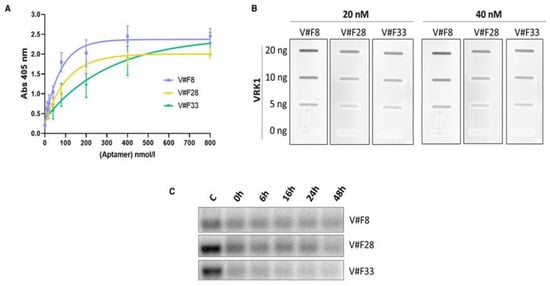 It is essential to study the high susceptibility of aptamers to enzymes in plasma for their future clinical applications and, therefore, to know if aptamers would need subsequent modifications taking into account their possible therapeutic future. Serum nuclease susceptibility of VRK1 aptamers was performed incubating 300 ng of aptamer in human plasma at 37 °C for 48 h, taking aliquots at times indicated in Figure 3C. Results show that both aptamers apVRKF8 and apVRKF28 are the most stable even after 24 h in the presence of plasma while the apVRKF33 is degraded earlier.