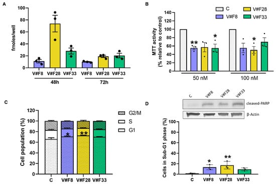 Next, we determined the effect of the aptamers in cell cycle distribution. MCF7 cells were transfected and 72 h after being studied by flow cytometry. As Figure 4C shows, both apVRKF8 and apVRKF28 aptamers significantly increased population in G1 phase (4.6 and 6.5%, respectively) compared with control cells, suggesting that apVRKF8 and apVRKF28 induce an arrest in the G1 phase of the cell cycle. Taking into account that the intracellular accumulation of the aptamer V#F28 at 48 h is the highest of the three aptamers (Figure 4A), we analyzed its effect in the cell cycle at this time showing an increase in 4.7% in G1 phase compared to control cells (Supplementary Figure S2). In addition, the percentage of cells in subG1 phase increased for the three aptamers being statistically significant for apVRKF8 and apVRKF28 aptamers compared with control no-transfected cells (Figure 4D) indicating that the three aptamers are able to induce apoptosis in MCF7 cells.