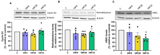 Previous data indicated the implication of VRK1 in cell cycle progression by inducing cyclin D1 expression. In order to inquire about the mechanism of action of our aptamers, we analyzed the effect of them in the cyclin D1 levels. A total of 24 h after transfection, MCF7 cells were lysed and analyzed by Western blot, showing that V#F28 significantly reduces cyclin D1 levels (15%) (Figure 5A). In parallel, we analyzed the levels of phosphorylated and total retinoblastoma (Rb) using an antibody against total Rb protein. The phosphorylated Rb, which migrates slowly in SDS-PAGE, did not change after treatment with the three aptamers (Figure 5B and Supplementary Figure S3A) while the three aptamers reduced at about 20–25% the levels of total Rb protein, being significant for apVRKF8 (Figure 5B). In addition, cyclinD1 and Rb protein levels correlated significantly (Spearman r = 0.721, p = 0.003). However, the levels of the proliferation marker PCNA did not change after the treatment with the aptamers (Supplementary Figure S3B). Interestingly, the three aptamers produced a reduction of 20% in VRK1 levels (Figure 5C). Altogether our findings support that VRK1 aptamers inhibit VRK1 activity and levels producing a reduction of cyclin D1 expression and arrest in G1 phase of the cell cycle, preventing cell cycle progression, which leads to a programmed cell death.