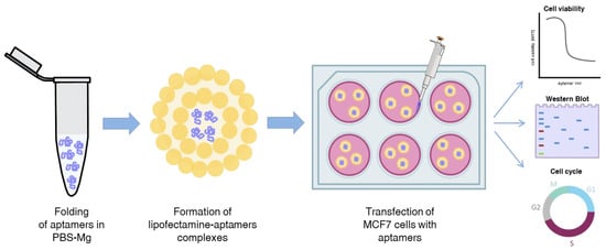Breast adenocarcinoma (MCF7) cells were grown in DMEM/Ham F-12 medium (Biowest SAS, France) (mixed 1:0.8) supplemented with 10% fetal bovine serum (Gibco, grand island, NY, USA), 1% pyruvate, 1% glutamine, 100 U/mL penicillin, 100 µg/mL streptomycin and 25 µg/mL amphotericin in a humidified 5% CO2/95% air incubator at 37 °C. Cells were passaged using trypsin 1× (Gibco) in culture medium. For aptamers transfection, cells were plated at different concentrations according to the assay and after 24 h, aptamers structured as indicated in Section 4.2, were transfected using LipofectamineTM 2000 (Invitrogen, Carlsbad, CA, USA) according to manufacturer’s recommendations. Cells were incubated at 37 °C in a humidified 5% CO2/95% air incubator until the assay was performed (Figure 7).