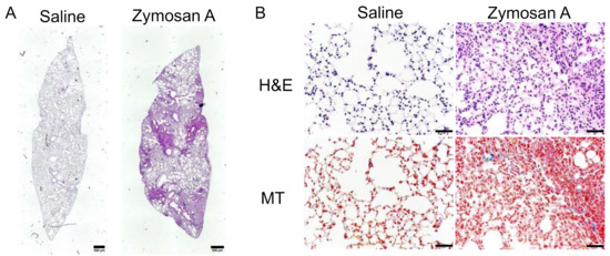 SKG mice spontaneously develop ILD at approximately 6 months of age under conventional conditions [34], but not under specific-pathogen-free (SPF) conditions [36]. Therefore, we induced ILD in SKG mice under SPF conditions at 8 weeks of age using the intraperitoneal administration of zymosan A. We confirmed that lung tissues collected 12 weeks after the administration of zymosan A exhibited multiple fibroblastic foci that were fibrotic areas with mononuclear cell infiltration and a consequently altered alveolar structure, while those from mice administered saline showed no signs of inflammation (Figure 1A,B). Masson’s trichrome (MT) stain showed collagen deposition colocalized with infiltrating cells in fibroblastic foci (Figure 1B), which confirmed that SKG mice administered zymosan A developed robust ILD in our SPF mouse facility.