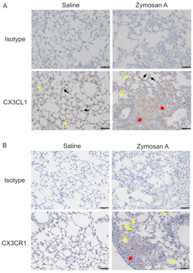 Mice were euthanized with an overdose of injectable anesthetics 12 weeks after the administration of zymosan A. Left lung tissue was fixed with 10% neutral formalin solution and embedded in paraffin. Three-micrometer-thick sections were used for hematoxylin and eosin (H&E) staining, the MT stain for collagen deposition, and an immunohistochemical analysis. In the immunohistochemical analysis, sections were stained with rabbit immunoglobulin as the isotype control (Dako X0903, Santa Clara, CA, USA), rabbit anti-CX3CL1 polyclonal Ab (pAb, Boster PA1401, Pleasanton, CA, USA), or anti-CX3CR1 (Abcam ab8021, Cambridge, UK,) after blocking endogenous peroxidase and consequent blocking with 2.5% goat serum. An incubation with the primary Ab was conducted at room temperature for 3 h for anti-CX3CL1 pAb or for 30 min for anti-CX3CR1 pAb. The ImmPRESS polymer kit (Vector MP-7451-15, Burlingame, CA, USA) was used to detect Ab staining, and counterstaining with hematoxylin was performed. All histological images were captured using a BX-63 microscope (Olympus, Tokyo, Japan).