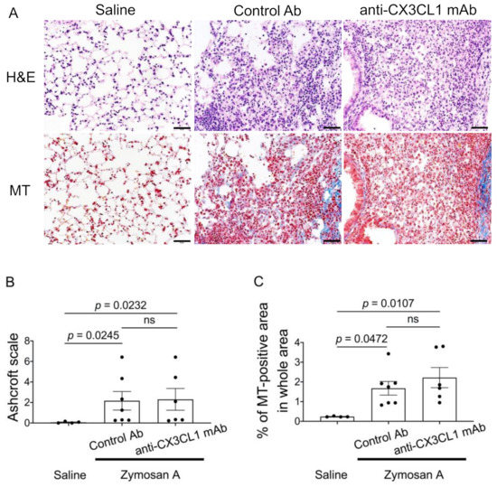 Based on the results showing that CX3CR1+ cell numbers increased in the lung tissue of SKG-ILD, we hypothesized that the migration of CX3CR1-positive cells contributes to lung inflammation and fibrosis. To address this hypothesis, we treated SKG-ILD mice with neutralizing anti-CX3CL1 mAb or a control antibody (Ab) and assessed the lung histology of ILD. Anti-CX3CL1 mAb was administered twice a week from the day of the administration of zymosan A until mice were euthanized. Lung tissue from control Ab- and anti-CX3CL1 mAb-treated mice both showed fibroblastic foci with massive cell infiltration and an altered alveolar structure (Figure 3A). The accumulation of collagen bundles was also similarly observed in lungs from control Ab-treated mice and anti-CX3XCL1 mAb-treated mice with MT staining (Figure 3A). No significant differences were noted in Ashcroft scores [37] or collagen-deposited areas between control Ab-treated mice and anti-CX3CL1 mAb-treated mice (Figure 3B,C). These results indicated that the inhibition of CX3CL1 had minimal effects on fibrotic changes in the lungs of SKG-ILD.