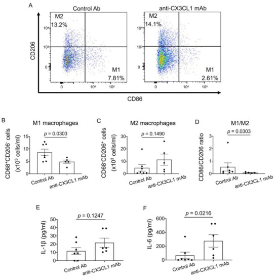 Since macrophages play a critical role in ILD, we examined M1 (CD86+CD206−) and M2 (CD206+CD86−) macrophages in BALF. The number of M2 macrophages was similar between control Ab-treated mice and anti-CX3CL1 mAb-treated mice (Figure 5A,C), which is consistent with the lack of an effect of the anti-CX3CL1 treatment on fibrosis. In contrast, the number of M1 macrophages significantly decreased following the anti-CX3CL1 mAb treatment (Figure 5B), and consequently the M1/M2 ratio significantly decreased (Figure 5D), suggesting skewed polarization toward M2 macrophages. However, the level of IL-1β in BALF was not altered and IL-6 in BALF rather increased following the anti-CX3CL1 mAb treatment (Figure 5E,F). Thus, these results indicate that anti-CX3CL1 mAb inhibited M1 macrophage infiltration and skewed polarization toward M2 macrophages, consistently with little anti-fibrotic effects of the blockade of CX3CL1.