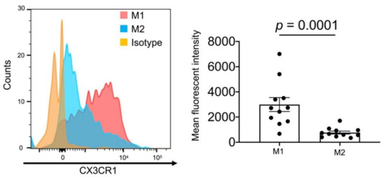 We examined CX3CR1 expression levels on BALF M1 and M2 macrophages in SKG-ILD mice. Although M1 and M2 macrophages both expressed CX3CR1, its expression levels were significantly higher in M1 macrophages than in M2 macrophages (mean fluorescent intensity; M1, 2994 ± 551.6, M2, 767.8 ± 117.9, Figure 6). This result suggested that the higher expression level of CX3CR1 more strongly inhibited the alveolar infiltration of M1 macrophages by anti-CX3CR1 mAb than that of M2 macrophages.