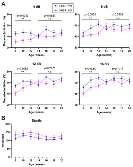 Dissociation of age effects on (A) PPI and (B) startle reflex in male C57Bl/6J-NPSR1 WT and KO mice. (A) One-way ANOVA showed no age effect on PPI in WT mice, whereas KO mice displayed significant age effects between 8 and 20 weeks at prepulse intensities of 4, 8, 12, and 16 dB. Two-way ANOVA revealed that PPI in KO mice was significantly lower than in WT controls between 8 and 12 weeks of age at all prepulse intensities, whereas no difference between genotypes was detected between 14 and 20 weeks of age. ** p < 0.01; n.s., not significant. (B) No age effect on startle reflex was detected in WT and KO mice and between genotypes. WT, n = 11; KO, n = 9.