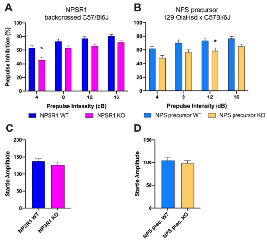 PPI in (A) backcrossed male C57Bl/6J-NPSR1 WT and KO mice, and (B) male NPS precursor WT and KO mice. Two-way ANOVA showed significant differences in PPI between C57Bl/6J-NPSR1 WT and KO mice, and NPS precursor WT and KO mice, respectively; * p < 0.05 vs. WT controls; Bonferroni’s post hoc test after significant two-way ANOVA. WT, n = 10; KO, n = 10. (C,D) Startle reflex. No difference in startle reflex between (C) backcrossed C57Bl/6J-NPSR1 WT and KO mice, or between (D) NPS precursor WT and KO mice. WT, n = 10; KO, n = 10.