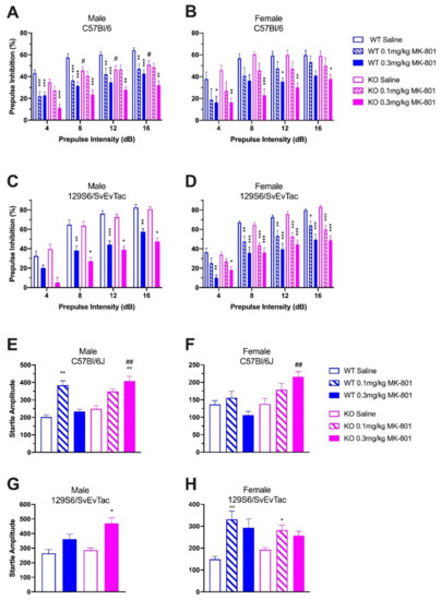 Influence of strain and gender on PPI and startle responses. MK-801-induced PPI disruption in (A) male and (B) female C57Bl/6J-NPSR1 WT and KO mice, and (C) male and (D) female 129S6/SvEvTac-NPSR1 WT and KO mice. Male, but not female, NPSR1 KO mice treated with saline or 0.3 mg/kg MK-801 showed attenuated PPI compared to WT controls with the same treatment in both strains; * p < 0.05, ** p < 0.01, *** p < 0.001 vs. saline-treated group within the same genotype; # p < 0.05 vs. WT saline-treated group; Bonferroni’s post hoc test after significant two-way ANOVA. Startle reflex in (E) male and (F) female C57Bl/6J-NPSR1 WT and KO mice, and (G) male and (H) female 129S6/SvEvTac-NPSR1 WT and KO mice after treatment with saline or MK-801. Male and female mice of both strains showed an increase in startle amplitude in response to MK-801, independent of genetic background. No difference in baseline startle amplitude between WT and KO mice within the same strain was detected; * p < 0.05, ** p < 0.01 vs. saline-treated group within the same genotype; Dunnett’s post hoc tests after significant one-way ANOVA. ## p < 0.01 vs. WT 0.3 mg/kg MK-801-treated group; t test). Animal numbers: (A and E) WT, n = 12–15; KO, n = 13–14; (B and F) WT, n = 10; KO, n = 10; (C and G) WT, n = 9; KO, n = 11–16; (D and H) WT, n = 8–12; KO, n = 12–13.