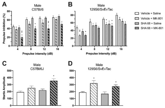 Effect of SHA 68 on 0.1 mg/kg MK-801-induced PPI disruption in male (A) C57Bl/6J and (B) 129S6/SvEvTac WT mice. (A) In C57Bl/6J mice, SHA 68 pretreatment aggravated MK-801-induced PPI disruption. (B) In 129S6/SvEvTac mice, SHA 68 alone significantly decreased PPI compared with saline-treated controls; * p < 0.05, ** p < 0.01 vs. ‘vehicle + saline’-treated group; Bonferroni’s post hoc test after significant two-way ANOVA. (C,D) Startle reflex. MK-801 alone or co-administration of MK-801 + SHA 68 significantly increased startle amplitude in male (C) C57Bl/6J and (D) 129S6/SvEvTac WT mice; * p < 0.05 vs. ‘vehicle + saline’-treatment group; t-test. Animal numbers: (A,C) n = 9–11; (B,D) n = 6.