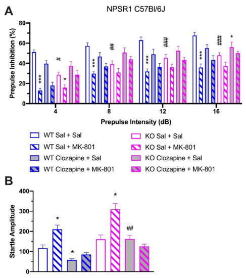 (A) Effect of clozapine on PPI disruption in male C57Bl/6J-NPSR1 WT and KO mice. Clozapine significantly attenuated 0.3 mg/kg MK-801-induced PPI impairment in both WT and KO mice and reversed the PPI deficits of NPSR1 KO mice; * p < 0.05, *** p < 0.01 vs. ‘saline + saline’-treated controls within the same genotype; # p < 0.05, ## p < 0.01, ### p < 0.001 vs. WT ‘saline + saline’-treated controls; Bonferroni’s post hoc test after significant two-way ANOVA. (B) Startle reflex after clozapine treatment. MK-801 increased startle amplitude whereas clozapine decreased baseline startle amplitude in WT mice and attenuated startle amplitude in MK-801-treated KO mice. KO mice showed significantly higher baseline startle amplitude than WT mice; * p < 0.05 vs. ‘saline + saline’-treated group within the same genotype; ## p < 0.01 vs. WT group which received the same treatment; t-test. Animal numbers: WT, n = 9–12; KO, n = 6–7.