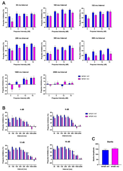 Looking at single prepulse levels across the range of ISIs tested, we found that the shape of PPI stimulus-response curves of NPSR1 WT and KO mice resembled the ISI-dependent PPI differences described for men and women [82], respectively. WT mice constantly display higher PPI than NPSR1 KO mice, and similarly men display higher PPI than women across all ISIs shorter than 1000 ms. At 1000 ms ISI, only NPSR1 KO mice exhibit prepulse facilitation (PPF) at low prepulse intensities (4 and 8 dB). Similarly, at the same ISI, more PPF is observed in women while rather PPI is seen in men [82]. At present, PPF has been less investigated compared to PPI and neuronal mechanisms underlying PPF remain largely unclear. One hypothesis suggests that PPI and PPF might be two aspects of a single underlying process, in which the sensory-motor gate is closed or narrow when ISIs are short (30–600 ms), thus inhibiting processing of newly incoming stimuli (pulse) while the current stimulus (prepulse) is being processed. When ISIs are long enough, however, the gate is open and ready to process the new stimulus because processing of the old stimulus has been completed [82,83,84]. In support of this theory, our results showed a smooth transition from PPI to PPF in NPSR1 KO mice.