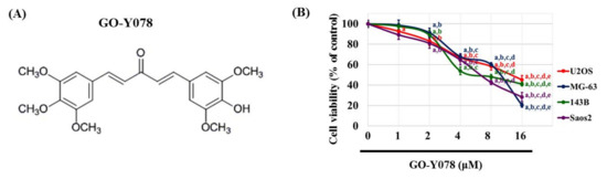2.1. Cytotoxicity of GO-Y078 in Human Osteosarcoma U2OS, MG-63, 143B, and Saos-2 Cells