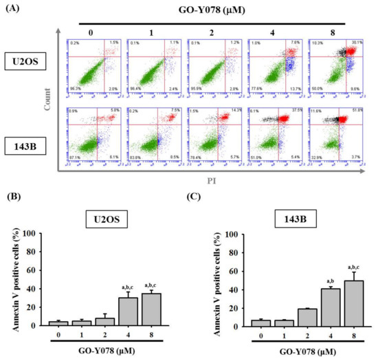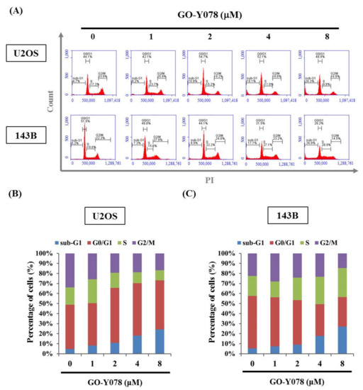 2.2. GO-Y078 Induces Apoptosis and Sub-G1 Fraction Arrest of U2OS and 143B Cells