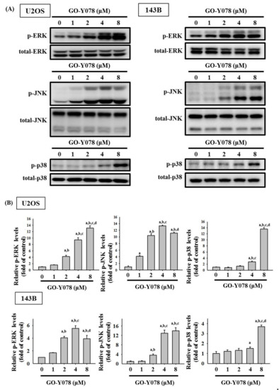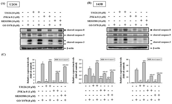 2.4. GO-Y078 Activates Extrinsic and Intrinsic Apoptotic Processes via JNK and p38 Pathways in U2OS and 143B Cells
