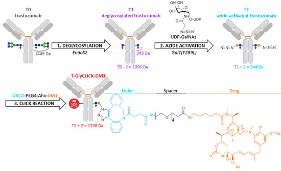 - van Geel, R.; Wijdeven, M.A.; Heesbeen, R.; Verkade, J.M.; Wasiel, A.A.; van Berkel, S.S.; van Delft, F.L. Chemoenzymatic Conjugation of Toxic Payloads to the Globally Conserved N-Glycan of Native mAbs Provides Homogeneous and Highly Efficacious Antibody-Drug Conjugates. Bioconj. Chem. 2015, 26, 2233–2242. [Google Scholar] [CrossRef]