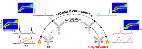 The following are available online at https://www.mdpi.com/article/10.3390/ph14060498/s1, Figure S1: Online SEC-nMS analysis of T-DM1, Figure S2: Online SEC-nMS analysis of T0, T1 and T2 after thermal stress, Table S1: TWCCSN2 measurements of intact and IdeS-digested reaction products, Figure S3: CIU experiments at the intact level for the 23+ charge state, Table S2: RMSDs between triplicates for CIU fingerprints at the intact level for 23+ and 24+ charge states.