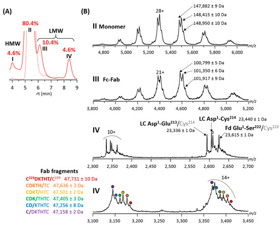 Online SEC-nMS analysis of thermally-stressed T-GlyCLICK-DM1. (A) Overlaid SEC chromatograms of stressed (solid line) and non-stressed (dotted line) samples. Relative amounts of HMWS and LMWS are given for the stressed sample; I = HMW dimers, II = main product, III = Fc-Fab fragments and IV = LC, Fd and Fab fragments. (B) SEC-nMS spectra of species generated upon thermal stress. ⬨ = sulfurized Cys214 (+32 Da compared to LC Asp1-Cys214).