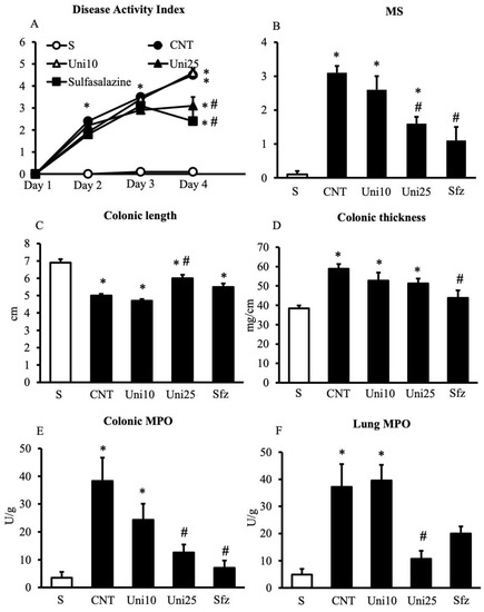 Effects of UniPR1331 on TNBS-induced inflammatory responses. Disease Activity Index (A), macroscopic score (MS) (B), colonic length (C), colonic thickness (D), colonic myeloperoxidase (MPO) (E) and lung MPO (F) activity assessed in vehicle-treated normal mice (S) and in TNBS-treated mice administered with vehicle (CNT), UniPR1331 10 mg/kg (Uni10), UniPR1331 25 mg/kg (Uni25), and sulfasalazine 50 mg/kg (Sfz) (n = 5–15 independent values per group). * p < 0.05 vs. S mice; # p < 0.05 vs. CNT mice; one-way or two-way (DAI) ANOVA followed by Bonferroni’s post-test; Kruskal-Wallis followed by Dunn’s post-test (MS).