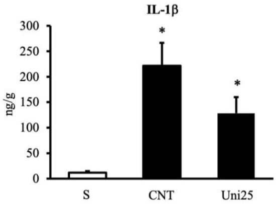 UniPR1331 attenuated TNBS-induced increase in IL-1β. IL-1β levels in colonic tissues excised from vehicle-treated normal mice (S) and TNBS-treated mice administered with vehicle (CNT) or UniPR1331 25 mg/kg (Uni25) (n = 6–10 independent values per group). * p < 0.05 vs. S mice, Kruskal-Wallis test followed by Dunn’s post-test.