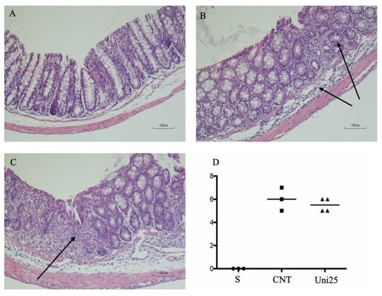 Representative hematoxylin-eosin stained sections of colonic specimens harvested from vehicle-treated S mice (A) and from TNBS-treated mice administered with vehicle (B) or UniPR1331 25 mg/kg (C). TNBS colonic instillation caused neutrophils infiltration and submucosal oedema (indicated by arrows) in vehicle-treated animals not attenuated in UniPR1331-treated mice (C). Panel (D) represents histological damage scoring of colonic sections obtained from vehicle-treated S mice (●), CNT mice (■) or UniPR1331-treated colitic mice (▲) (horizontal bar at the median value).