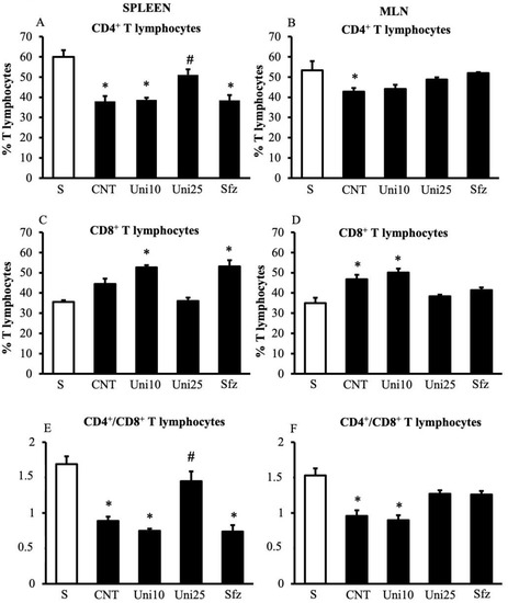 UniPR1331 mitigated TNBS-induced changes in spleen T cells profile. Percentages of CD4+ (A,B), CD8+ (C,D), and the ratio between CD4+ and CD8+ T lymphocytes (E,F) were assessed in the spleen (A,C,E) and MLN (B,D,F) excised from vehicle-treated normal mice (S) and TNBS-treated mice administered with vehicle (CNT), UniPR1331 10 mg/kg (Uni10) or 25 mg/kg (Uni25), or sulfasalazine 50 mg/kg (Sfz) (n = 5–15 independent values per group). * p < 0.05 vs. S mice; # p < 0.05 vs. CNT mice, one-way ANOVA followed by Bonferroni’s post-test.