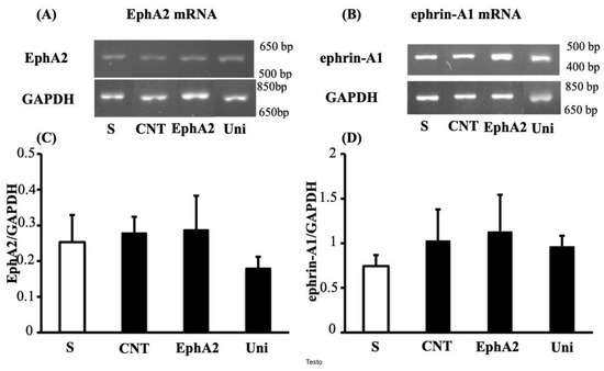 PCR was conducted for 36 cycles to amplify Eph/ephrin cDNA sequences according to Ogawa et al., 2006 [20] and Mukai et al., 2017 [21]. The following conditions were used for amplification: EphA2: denaturation for 45 s at 94 °C, annealing for 45 s at 62.5 °C, extension for 60 s at 72 °C; ephrin-A1: denaturation for 45 s at 94 °C, annealing for 45 s at 60 °C, extension for 60 s at 72 °C; EphB4: denaturation for 10 s at 94 °C, annealing for 45 s at 53 °C and extension for 3 min at 68 °C; ephrinB2: denaturation for 45 s at 94 °C, annealing for 45 s at 53 °C and extension for 90 s at 72 °C. PCR products were separated on 1% agarose gels, visualized with a ChemiDoc™ Imaging System (Bio-Rad, Berkeley, CA, USA) after staining with RedSafe™ (iNtRON Biotechnology, Seongnam, Korea) and analysed by means of Image Lab™ software (version 6.0, Bio-Rad Laboratories, Inc., CA, USA). Expression levels of Eph/ephrin mRNAs were determined from 5–7 independent samples after normalization by reference to the signal intensity of the band of GAPDH mRNA (PCR for 30 cycles, denaturation for 45 s at 94 °C, annealing for 45 s at 93 °C, extension for 90 s at 72 °C) obtained in the same specimen.