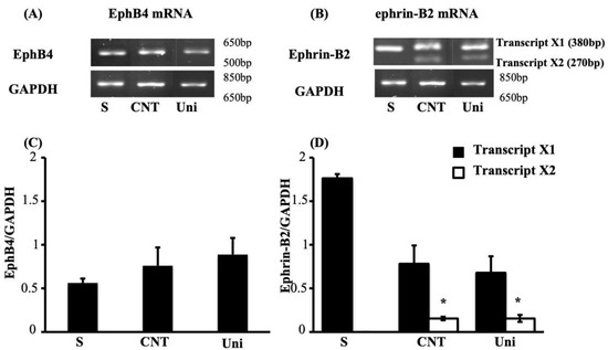 In the case of EphB4 mRNA also, whose levels, along with those of ephrin-B2, had been already presented for S, CNT and EphB4-treated mice by Grandi, Zini et al. [7], neither the instillation of the haptenating agent nor that of UniPR1331 modified their production with respect to S tissues (Figure 6A,C). Concerning ephrin-B2 gene expression, the instillation of TNBS promoted the appearance of an additional mRNA band, corresponding to a splice variant of ephrin-B2 gene, with similar intensity in vehicle-treated and in UniPR1331-treated mice (Figure 6B,D).