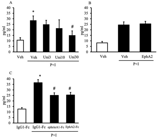 Effects of UniPR1331 and EphA/ephrin-A recombinant proteins on splenic mononuclear cells activation. TNFα levels, released by cultured splenic mononuclear cells, when incubated with: (A) DMSO 0.3% (Veh), UniPR1331 3–30 μg/mL (Uni3, Uni10, Uni30); (B) saline solution (Veh), EphA2 1 μg/mL; (C) IgG1-Fc 0.3 μg/mL, ephrin-A1-Fc 0.5 μg/mL, EphA2-Fc 1 μg/mL. The assays were performed in the absence (white bar) or in the presence (black bars) of PMA 50 ng/mL (P) and ionomycin 500 ng/mL (I) (n = 5–8 independent values per group). * p < 0.05 vs. unstimulated; # p < 0.05 vs. vehicle or IgG1-Fc in the presence of P + I; one-way ANOVA followed by Bonferroni’s post-test.