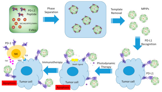 In the present work, multifunctional MIP NPs were synthesized for cancer cell destruction. As shown in Figure 1, merocyanine (MC540) molecules were immobilized on the surface of magnetic nanoparticles (MNPs). These MC540/MNPs were then mixed with a peptide from PD-L1 and poly(ethylene-co-vinyl alcohol) solution to form multifunctional magnetic peptide-imprinted composite nanoparticles (MPIPs/MC540). These MPIPs were characterized for their size distribution, recognition capacity, specific surface area, and magnetization. Natural killer-92 (NK-92) cells were added to human hepatoma (HepG2) cells, which were then incubated with these composite nanoparticles and illuminated with visible light for varying durations. The viability and apoptosis pathway of HepG2 were investigated using cell counting kit-8 (CCK8) and quantitative real-time polymerase chain reaction (qRT-PCR). Finally, treatment with composite nanoparticles and irradiation of light was performed on an animal xenograft model.