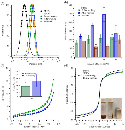 (a) Particles size distributions of MNPs (●); MPIPs before (●), after (●) template removal and rebound with template (●). (b) Mean diameters of MPIPs before, after template removal and rebound with template containing various ethylene mol% of EVAL. (c) Surface area of MPIPs before (●) and after (●) template removal measured by adsorption and desorption of nitrogen. (d) Magnetization of MNPs and MPIPs before and after template removal. Inset: MPIPs on the walls of a vial under magnetic field.