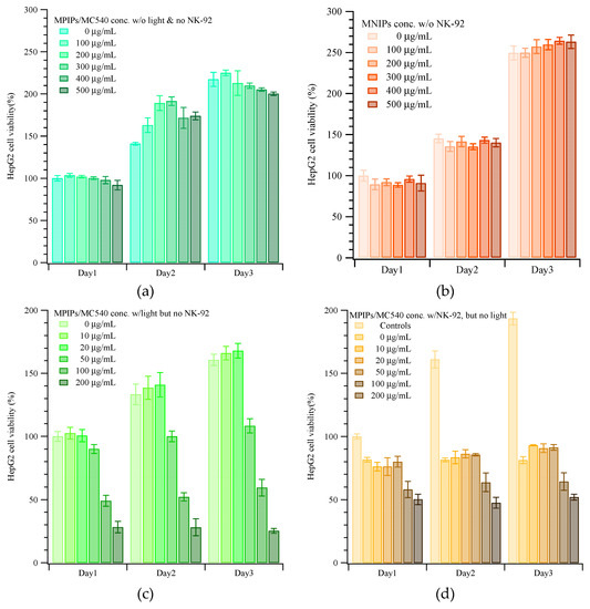 Figure 3 displays the viabilities of HepG2 cells when dosed with different concentrations of nanoparticles, with or without NK cells and with or without irradiation. Without NK-92 cells and without illumination, the viability of HepG2 cells with various concentrations of MNIPs was about 95%, increasing to 140 and 250% on the second and third days compared to the controls on day 0, as shown in Figure 3a. (Viabilities >100% reflect continued cell growth and division.) In contrast, the viability of HepG2 cells with various concentrations of MPIP/MC540 was about 95%, increasing to 160 and 200% on the second and third days compared to the controls on day 0, as shown in Figure 3b. The phototoxicity of MPIP/MC540 up to 500 μg/mL after 1 day is shown in Figure S2c; the viability for every day administration of a lower concentration of MPIPs/MC540 after 1–3 days is shown in Figure 3c. Treatment with MPIPs/MC540, followed by NK-92 cells after 1 day ((but without irradiation), Figure 3d)), resulted in arrested growth of the cell population, essentially regardless of the MPIPs/MC540 concentration. High MPIPs/MC540 concentrations did result in greater prompt cell death, but even the lowest concentration (zero) showed negligible cell growth. The inhibition of cell growth thus appears to be caused by the NK-92 cells alone [43]. Figure 3e shows the combined effects of phototoxicity and NK-92 treatment. Cells were maintained in media containing different concentrations of MPIP/MC540; each day, cells were treated with photodynamic therapy for 15 min. (The medium was also changed every day, but replaced with fresh medium containing the specified concentration of MPIPs/MC540.) The viabilities are lower than with NK-92 killer cells alone. If MPIPs block PD-L1 and prevent it from binding to PD-1, they should enhance the ability of NK-92 cells to destroy HepG2 cancer cells. Figure 3f demonstrates that a combination of photodynamic therapy and immunotherapy can increase the in vitro suppression of HepG2 cells.