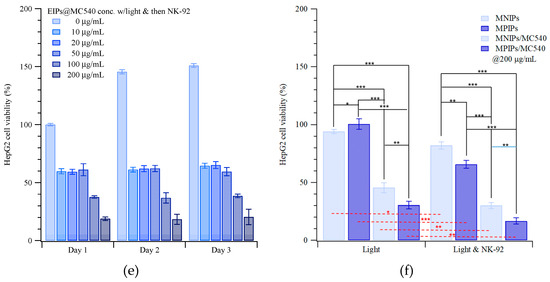 Continuous cellular viability measurements of HepG2 cells incubated with various concentrations of (a) MNIPs, (b) MPIPs/MC540 without irradiation or NK-92 treatment, (c) MPIPs/MC540 with irradiation. (d) MPIPs/MC540 with NK-92 treatment, (e) MPIPs/MC540 with irradiation or NK-92 treatment, (f) Comparison of cellular viability of HepG2 cells with NK-92 cells (2 × 104 cells/well), MNIPs/MC540 or MPIPs/MC540 (200 μg/mL) with or without addition of NK-92 cells NK-92 cells (2 × 104 cells/well) under irradiation (* p < 0.05; ** p < 0.005; *** p < 0.0005).