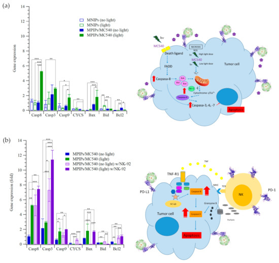 Relative gene expression of cellular apoptosis (Casp8, Casp3, Casp9, CYCS, Bax, Bid and Bcl-2) of HepG2 cells treated with (a) MNIPs, MPIPs/MC540 and (b) MPIPs/MC540 and additional NK-92 cells (2 × 104 cells/well) under irradiation or not (* p < 0.05; ** p < 0.005; *** p < 0.0005).