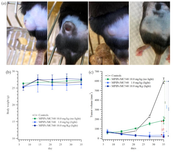 The treatment of an animal tumor model using composite nanoparticles is shown in Figure 5. In Figure 5a, photographs of mice treated with PBS (control), 10.0, 1.0 and 10.0 mg/kg of MPIPs/MC540; the latter two groups were irradiated with 15 min of 520 nm light. All mice had initially similar body mass of 24–29 g. The tumor volume for the control increased from 65 to 600 mm3 over 11 days. Both the low and high dosages of MPIPs/MC540 accompanied by irradiation with light were effective at decreasing tumor size from 60–75 mm3 to 33.1 ± 28.9 and 17.6 ± 4.8 mm3, respectively. Surprisingly, the high dosage of MPIPs/MC540 (alone, without irradiation) still suppressed the growth of tumor, keeping it about 1/3 the size of the control. Nonetheless, the most effective treatment combined MPIPs/MC540 with irradiation.