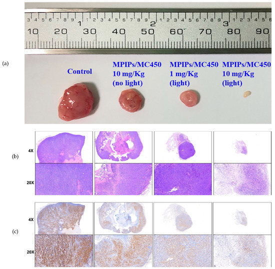 The animal experiments were approved by the Institutional Animal Care and Use Committees (IACUC) of National University of Kaohsiung (NUK) (protocol No. 10708, 10 November 2018) and performed in accordance with the Association for Assessment and Accreditation of Laboratory Animal Care guidelines (http://www.aaalac.org, accessed on 25 May 2021). To generate murine subcutaneous tumors, (1 × 106 cells/mouse) Hepa1-6 tumor cells were transplanted into the right flank of C57CL/6 mice. When the tumor volumes were around 50∼100 mm3, the mice were randomly divided into four groups and were intravenously injected with PBS, MEIPs/MC540 (1.0 or 10.0 mg/kg). One hour after injection, the low (1.0 mg/kg) and (10.0 mg/kg) groups were then irradiated with light (wavelength 520 nm, intensity 1W) for 15 min. This treatment was performed twice a week for 5 weeks. On fifth week after the start of treatment, tumors were removed. Tumors were measured twice weekly, and the tumor volume (mm3) was calculated as (long diameter × short diameter2)/2. Once the mice exhibit signs of impaired health or when the volume of the tumor exceeded 1.5 cm3, the mice were euthanized with CO2.