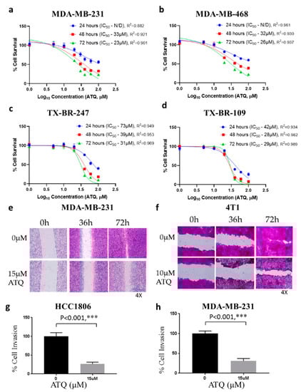 Considering breast tumor heterogeneity, we tested the cytotoxic effects of ATQ in four different breast cancer cell lines including two patient-derived breast metastatic cell lines. Treatment of MDA-MB-231 and MDA-MB-468 breast cancer cells with increasing concentrations of ATQ significantly reduced the survival of these cells in a concentration and time-dependent manner with an IC50 ranging between 23–33 µM after 48 and 72 h treatment (Figure 1a,b). Interestingly, the proliferation of metastatic patient-derived TX-BR-247 and TX-BR-109 cells was inhibited by ATQ treatment. TX-BR-247 is a triple negative cell line (estrogen, progesterone and HER2 receptor negative), whereas TX-BR-109 cell line is HER2 null. The IC50 was found to be in the range of 29–31 µM after 72 h treatment in TX-BR-247 and TX-BR-109 cells suggesting ATQ is effective against patient-derived cells as well. (Figure 1c,d).