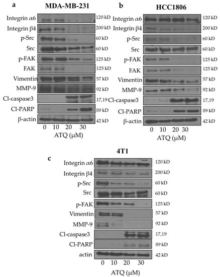 MDA-MB-231, HCC1806 and 4T1 cells were exposed to varying concentrations of ATQ for 72 h. Cells were collected, lysed, and approximately 30–50 μg of protein was subjected to SDS-gel electrophoresis followed by immunoblotting as previously described by us [,]. The antibodies integrinα6 (#3750, rabbit mAb), p-Src (#6943, rabbit mAb), Src (#2108, rabbit mAb), p-FAK (#3283, rabbit mAb), Vimentin (#3932, rabbit mAb), MMP9 (#2270, rabbit mAb), Cl-caspase3 (#9664, rabbit mAb), Cl-PARP (#9541, rabbit mAb) were purchased from Cell Signaling Technologies (Danvers, MA, USA). Integrinβ4 (#sc377523, mouse mAb), FAK (#sc1688, mouse mAb) was purchased from Santa Cruz Biotechnology and β-actin (#A5441, mouse mAb) was purchased from Sigma (St. Louis, MO, USA).