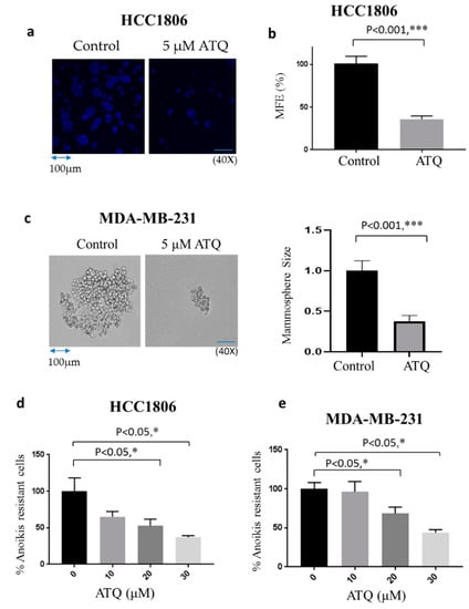 Anoikis is a type of cell death, which is triggered by detachment of cells from the ECM. Various studies have shown that cancer cells need to overcome anoikis in order to acquire metastatic characteristics []. To determine the effect of ATQ on anoikis resistant cells, HCC1806 and MDA-MB-231 cells were made anoikis-resistant after culturing them onto ultra-low attachment plates for 48 h. These anoikis resistant cells were treated with varying concentrations of ATQ for 72 h. The treated cells were re-cultured on an adherent plate and analyzed by Sulforhodamine B (SRB) assay for cell viability. We observed that ATQ treatment group had lower cell viability as compared to dimethyl sulfoxide (DMSO)-treated control group. These results indicate that ATQ treatment reduced anoikis resistance in HCC1806 and MDA-MB-231 cells in a concentration-dependent manner (Figure 3d,e).