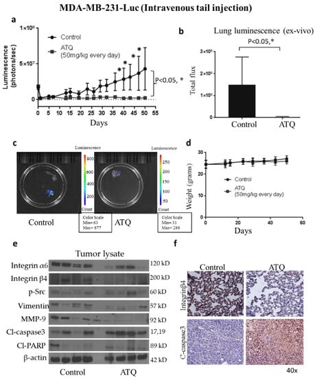 To evaluate the anti-metastatic effects of ATQ, we performed three different in vivo tumor models using three different cell lines. In the first experiment, we evaluated the efficacy of ATQ in suppressing the growth of metastasized breast tumors in lungs. Human breast cancer MDA-MB-231 cells were injected into the tail vein of athymic nude mice (n = 16) with the objective that most of the cells can lodge into lungs. Once tumor localization was confirmed by luminescence, mice were randomly divided into two groups with eight mice in each group. Treatment group received 50 mg/kg ATQ everyday by oral gavage. The tumor growth was monitored by measuring tumor luminescence periodically using IVIS imaging system. Representative IVIS images of mice from control and ATQ treated group at Day 50 are shown in Figure S2A. Our results showed that oral administration of ATQ significantly reduced the growth of breast tumors in lungs by 90% (Figure 4a). At the end of experiment, lungs were isolated and luminescence was recorded. We observed that the average luminescence in the lungs of ATQ treated mice was reduced by 80% as compared to the control group (Figure 4b,c). The mice were periodically weighed during the experiment. We did not observe any significant difference in the bodyweight of control vs. treated mice–indicating no obvious toxicity by ATQ treatment (Figure 4d). Tumors collected from control and treated mice were subjected to Western blot analysis. In Figure 4e, each band represents lysate from a separate tumor coming from a separate mouse. Intriguingly, remarkable suppression of Integrin α6, integrin ’β4, metastatic markers—vimentin and MMP-9, and enhanced cleavage of caspase-3 was observed in ATQ-treated tumor lysate (Figure 4e). These observations were also confirmed by IHC staining of tumors from control and ATQ-treated mice for integrin β4 and cleaved caspase-3 (Figure 4f). These results indicate that breast tumor growth suppression by ATQ in lungs was associated with inhibition of integrin signaling and induction of apoptosis.