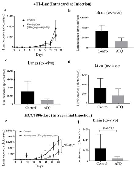 Female Balb/c mice (4–6 weeks old) were obtained from Charles River (Wilmington, MA, USA) and maintained as per the IACUC guidelines. For the metastatic breast cancer model, we used 4T1-BR (brain seeking) cells and injected these cells in the heart of each mouse. This method was first described by Conley and later by other groups including our lab [,]. In this model, exponentially growing 4T1-BR luciferase cells (2.5 × 104 cells/50 µL) were harvested, washed and injected into the heart’s left ventricle of 20 mice using stereotaxic apparatus. The luminescence from cells injected was observed in brain within 5 min of intracardiac injection of cells. After confirming the luminescence in 16 mice out of 20, mice were randomly divided into two groups with 8 mice in each group. The mice without luminescence were excluded from the study. Treatment group received 50 mg/kg ATQ everyday by oral gavage. The luminescence signal from mice was used to analyze rate and extent of metastasis. The experiment was terminated at Day 16 by humanely euthanizing the mice with CO2 overdose followed by cervical dislocation. Mice brain, lungs and liver were carefully dissected, weighed and imaged for luminescence.