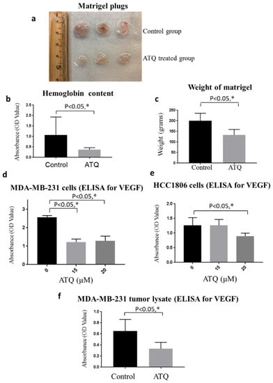Matrigel plug assay was performed as described earlier []. Approximately 250 µL matrigel (BD Biosciences, Bedford, MA, USA) containing 40 ng/mL VEGF and 10 ng/mL FGF were injected subcutaneously into 6–8-week-old female athymic nude mice. The injected matrigel rapidly formed a single, solid gel plug. Starting from next day, mice were gavaged with 50 mg/kg ATQ daily for 12 days, after which they were euthanized and the matrigel plugs were recovered. The plugs were dispersed in PBS. Hemoglobin content in matrigel was measured using Drabkin’s reagent (Sigma-Aldrich, St. Louis, MO, USA) according to manufacturer’s instructions, to quantify blood vessel formation.