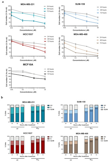 Effect of selinexor on cell growth and cell cycle distribution of TNBC cell lines. (a) MDA-MB-231, SUM-159, HCC1037, MDA-MB-468 cells and human normal breast cells (MCF-10A) were cultured for different time intervals in the presence of increasing concentrations of selinexor or 0.1% (v/v) DMSO (control cells; ctr), and the cytotoxic activity was assessed by MTS assay. Data are expressed as the percentage of cells (mean values ± SD of three independent experiments) in each conditions with respect to control cells (ctr). (b) Flow cytometric analysis of cell cycle distribution in TNBC cells exposed to 0.1% (v/v) DMSO (control cells; ctr) and selinexor (IC50 at 72 h, as reported in Table 1). Data are reported as the percentage of cells in G1, S, and G2/M phases and represent the mean values of three independent experiments; SDs were always within 5%. Only G1 phase comparisons were explicited. * p < 0.05, *** p < 0.005 Tukey’s post hoc test.