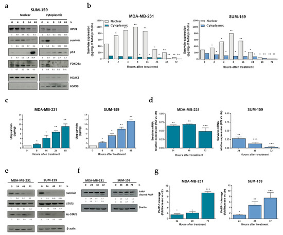 Consistent with the anti-apoptotic role of survivin, selinexor-induced down-regulation of the protein was followed by a time-dependent apoptotic response, as detected by the cleavage of the PARP-1 by caspase-3 in both MDA-MB-231 and SUM-159 cell lines (Figure 2f,g). Nuclear accumulation of other XPO1 target proteins, such as p53 and Foxo3a, was observed after selienxor exosure of TNBC cells (Figure 2a).