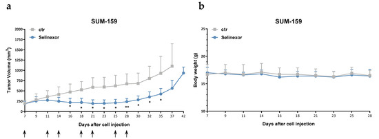 Efficacy of oral selinexor on TNBC xenografts. (a) Tumor growth curves of SUM-159 cells orthotopically injected into SCID mice. Mice were randomly grouped (6 mice/group) to receive vehicle (ctr) or selinexor (10 mg/kg, q3-4d × 8). Each point indicates the mean tumor volume in the group. Bars represent SD. Arrows indicate the day of the treatment. (b) Body weights of mice during the treatment period. Each point indicates the mean weight of mice in each group. Bars represent SD. * p < 0.05, ** p < 0.01, Student′s t-test.