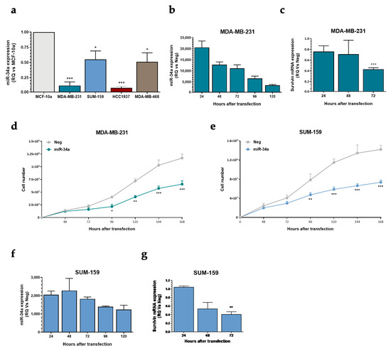 Looking for a strategy aimed at improving the activity of selinexor in the poorly responsive TNBC model, we evaluated the effects of miR-34a ectopic expression on TNBC cells. miR-34a is an onco-suppressive miRNA known to be down-regulated in different tumor types [17], including TNBC [18], and previously reported to target survivin [19,20,21]. Quantitative RT-PCR results indicated that miR-34a abundance is consistently reduced in the four TNBC cell lines compared to the normal human breast cell line MCF-10A (Figure 4a). Enforced expression of miR-34a (Figure 4b) in MDA-MB-231 cells was paralleled by a time-dependent decrease of survivin mRNA expression levels (Figure 4c), and resulted in a time-dependent cell growth delay (Figure 4d). Comparable results were obtained in SUM-159 cells (Figure 4e–g).